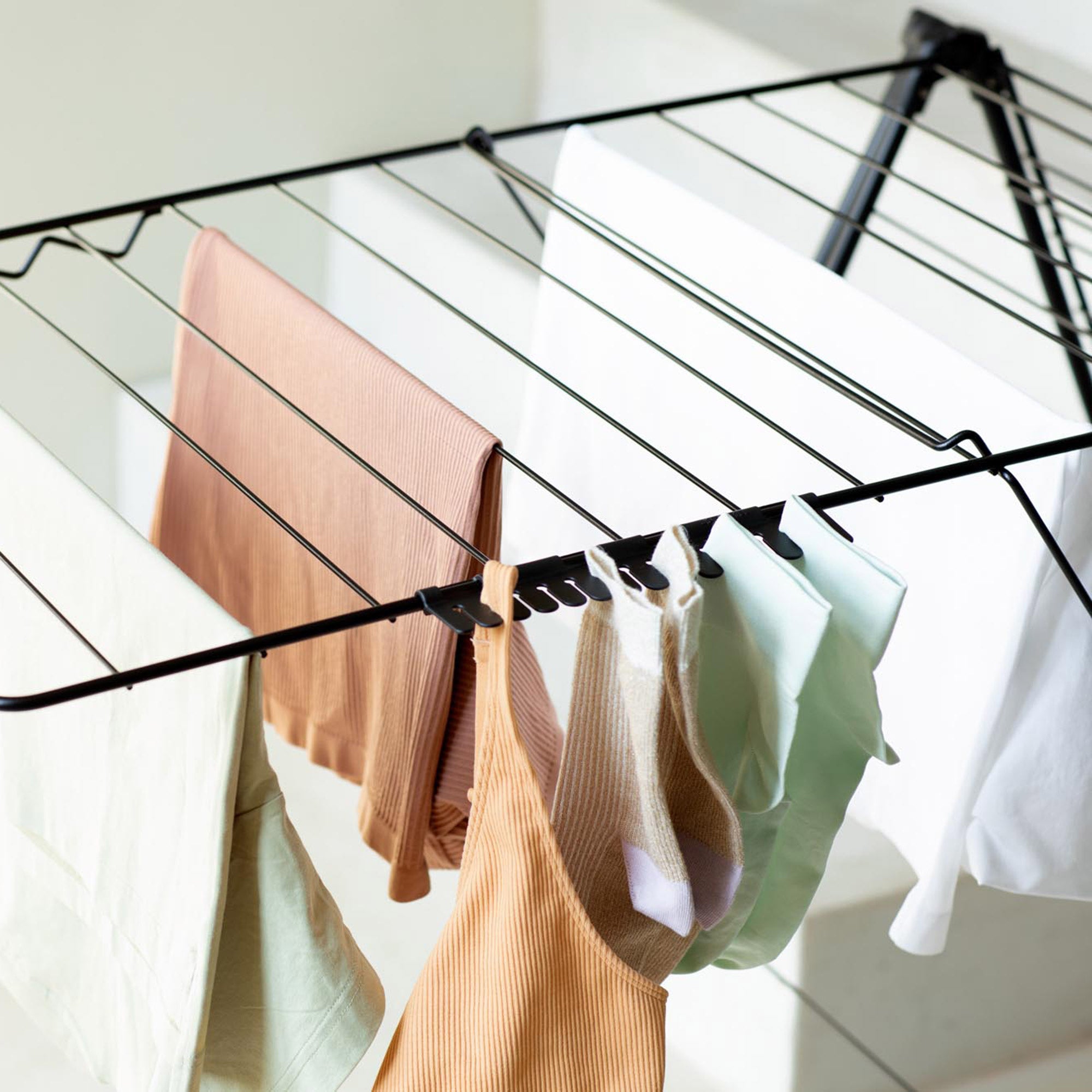 Could do with some extra space for drying small items? Add this set of 2 Brabantia Sock Holders to your Brabantia HangOn Drying Rack or Drying Rack T-model. Nifty click-on drying space, no pegs needed. Just slide your socks or bras between the flexible teeth. A laundry accessory sure to make you smile!FeaturesMore sustainable choice - 100% recyclable after useDouble easy - set of two holdersHandy hangout - made for smaller laundry items, like socks, bras and underwearExtra hanging space - for up 28 small items in totalFast - no pegs needed, slide items between the teethPerfect match - fits Brabantia HangOn and T-model Drying Rack2 year guarantee and service