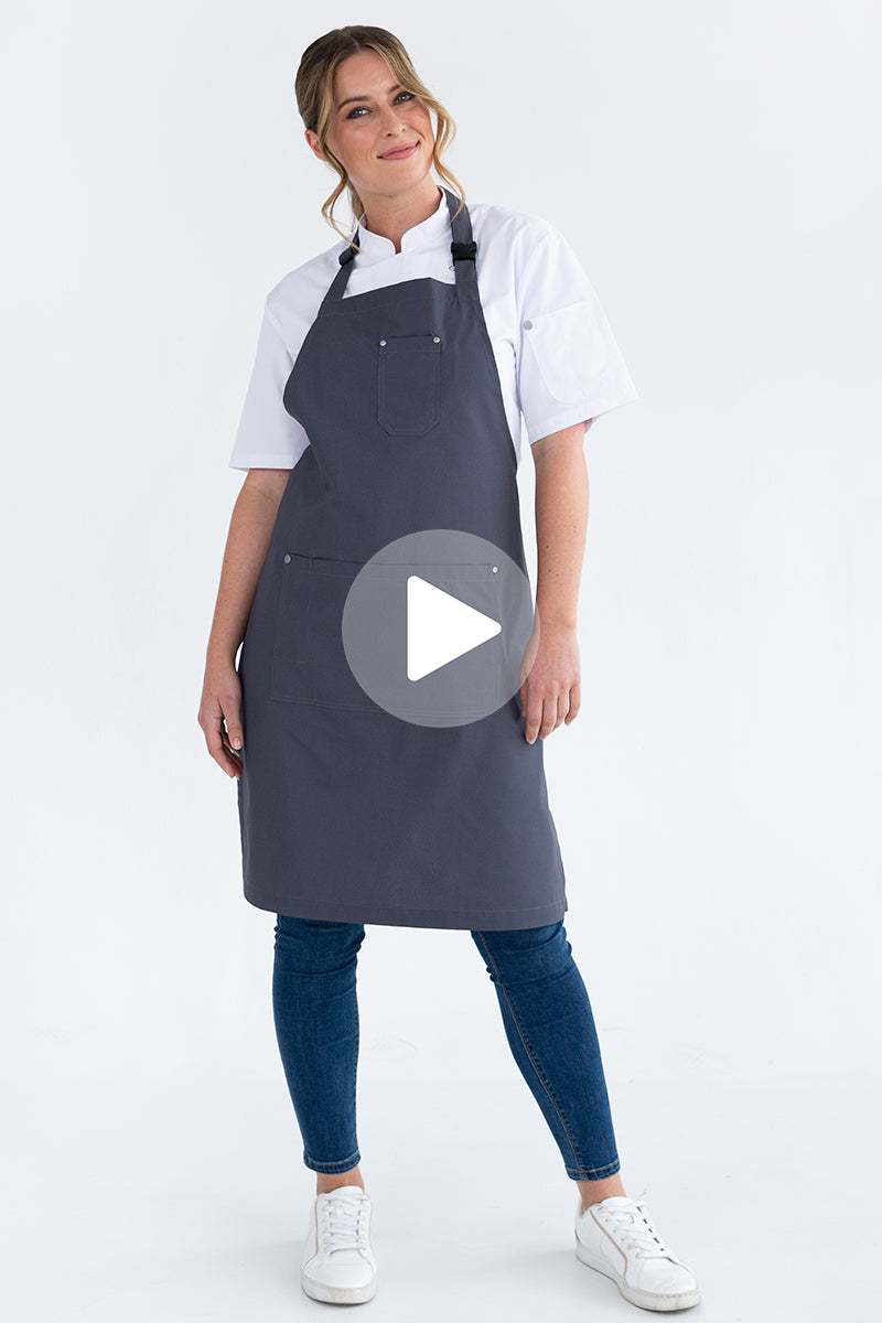 The dark grey ALEX CHEF bib apron is a subtle, sophisticated choice that lifts your game, whether over a classic tee shirt or your crew‚ Aussie chef uniforms. An ideal chef apron that meets the demands of the kitchen but is also a good choice for front-of-house staff, baristas, and cafe apron-clad waiters. The easy-release plastic adjustable neck buckle adds a nice touch to the apron, and with handy chest and waist pockets - it is sure to please anyone.