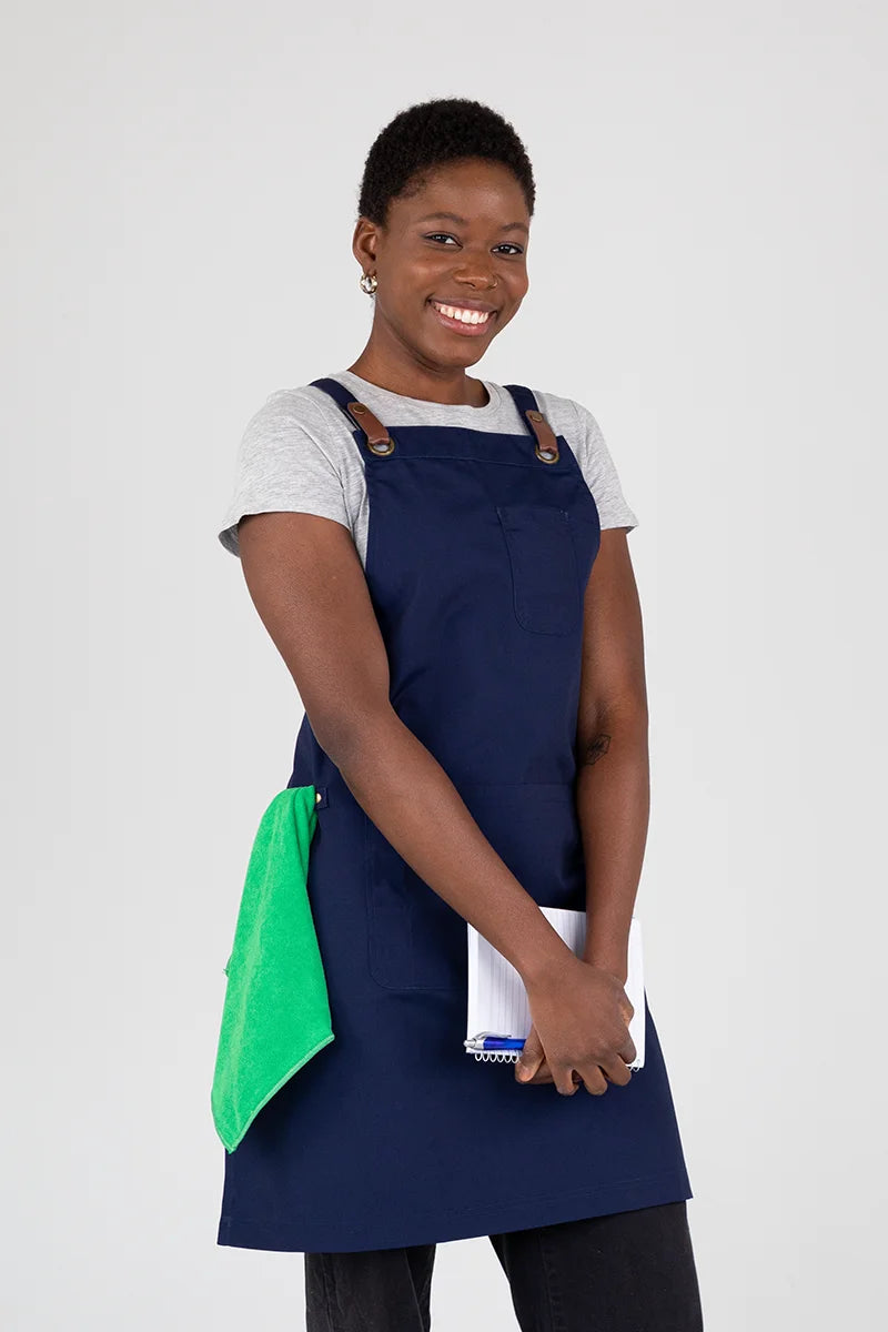 Its cross-back straps in matching fabric have tan leather look detailing with a press stud closure that simply loops through brass-coloured eyelets for a stunning look. Plus, the cross-back straps distribute the weight of the apron over your shoulders making it super comfortable to wear for long periods.