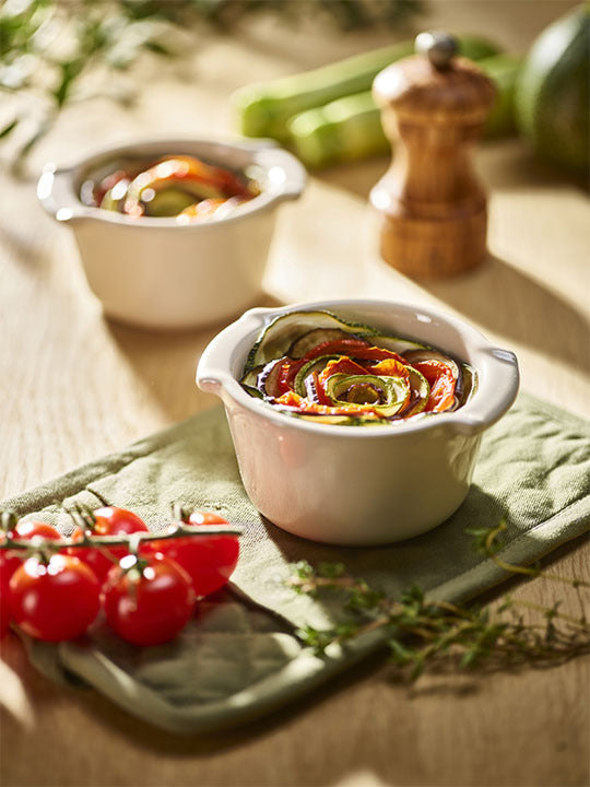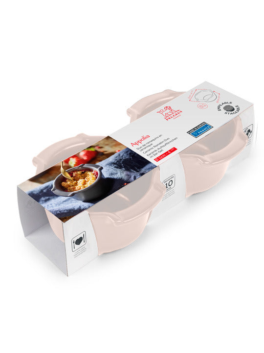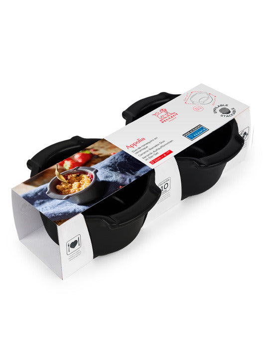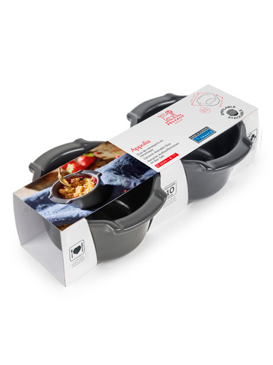 It’s never been easier to prepare, bake or serve your gourmet recipes than it is with the Peugeot set of ramekins. Their high-quality ceramic composition ensures perfect baking, and their deep-coloured enamels will stand up to everyday use, making it extremely easy to dish up and to clean up afterwards. They are smart and versatile, with handles to make it easier to move them around, and a stackable design to save space in your cupboards. Essential for your daily kitchen activities.