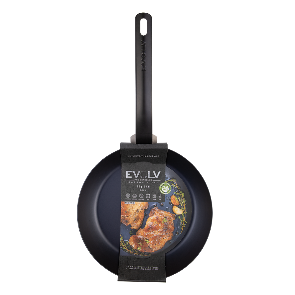The Evolv 24cm Carbon Steel Fry Pan delivers high-heat performance with the responsiveness cooks want for proper browning and crisp results. Made from heavy-gauge 2mm carbon steel, it heats quickly, distributes heat evenly and holds temperature well for confident searing.