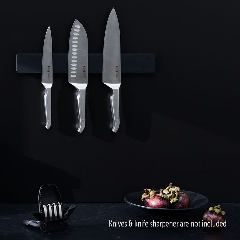 Store your knives like the pros with this easy to install wall mounted knife rack. Its extra strong magnet holds knives securely in place and thanks to its black silicone coating the wall rack is scratch resistant and kind on knives too. Suitable for mounting on tile, brick or wood. The wall rack is also available as part of the 7 piece Furi Knife set.