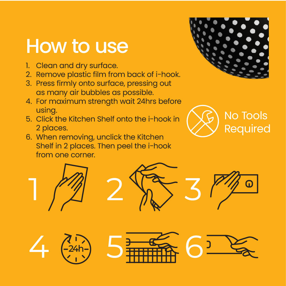 The i-hook Kitchen Shelf is easy to install. No need for drills or screws – just clean the surface, press, and attach. This ensures minimal potential damage to your surfaces.
