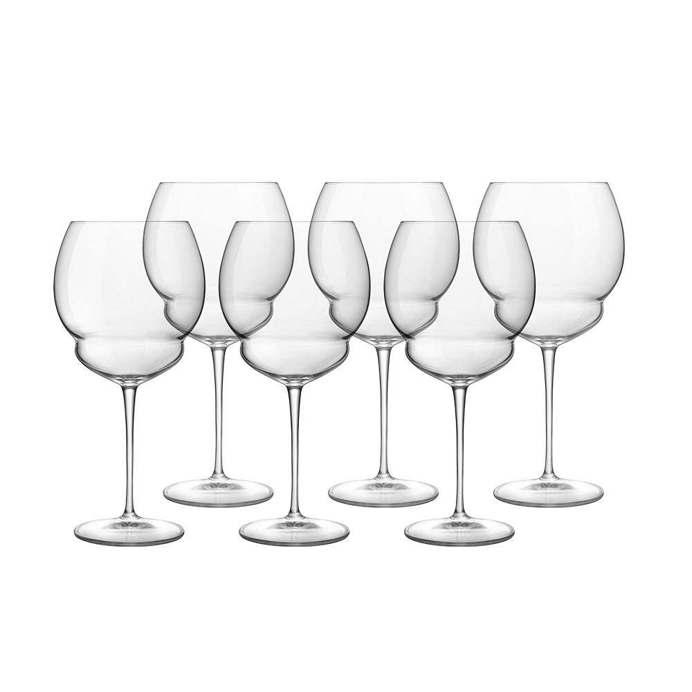 Six glasses, 800ml capacity, large balloon design with a soft, sculptural curved bowl and elegant thin stems.