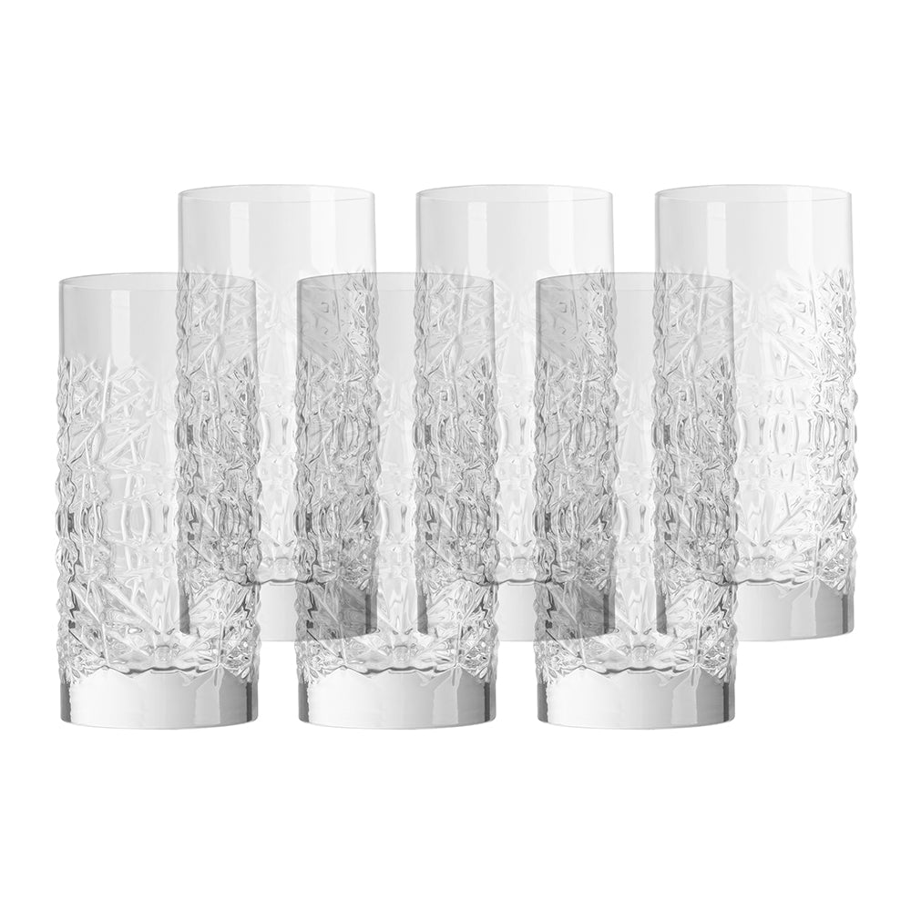 Six glasses, 480ml glass featuring an artfully faceted square design that is textured on the hands but soft and smooth around the rim and thick base that provides stability and makes it easy to hold.