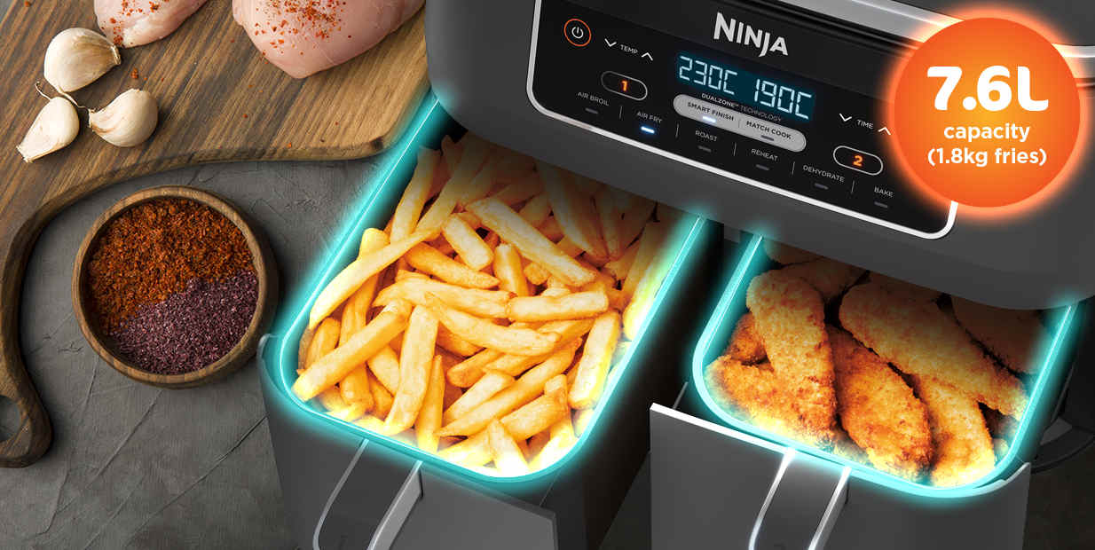 The Ninja® Foodi® Dual Zone Air Fryer is the first air fryer with 2 independent 3.8L baskets that let you cook 2 foods, 2 ways, at the same time, not back-to-back like a traditional single-basket air fryer.