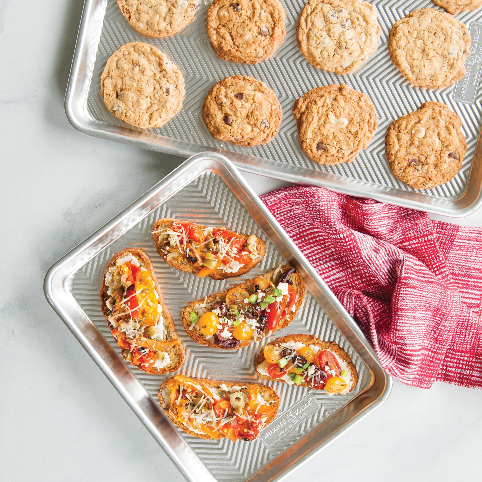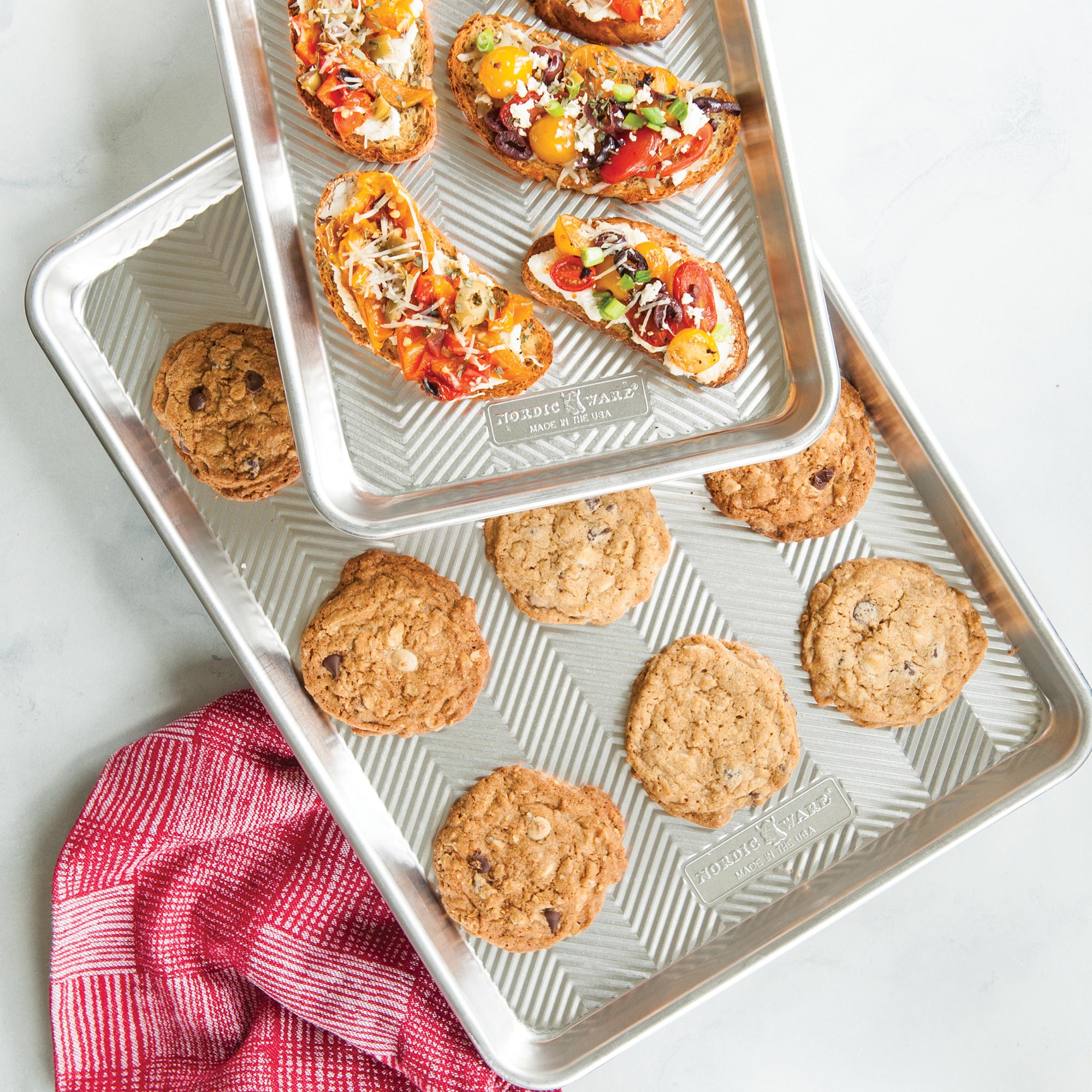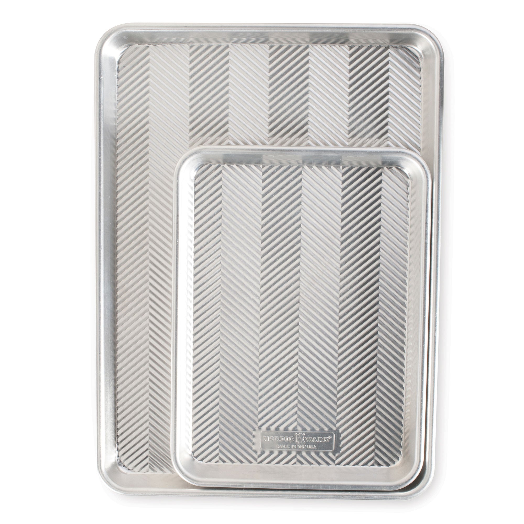 Embossed Natural Aluminium Bakeware enhances the look and performance of our hugely popular baking pans. Exclusive Prism grid adds durability and provides easy release while also improving air flow for uniform crisping. Encapsulated galvanized steel rims prevent warping. Baker's Bundle includes one Prism Half Sheet and Prism Quarter Sheet - essentials for the kitchen!