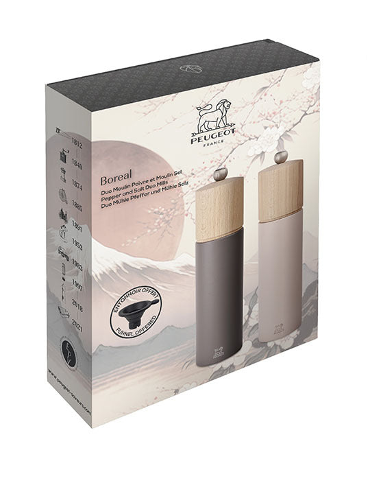 The Boreal salt and pepper mills have a long, pure silhouette in delicate shades of naturalness and harmony.