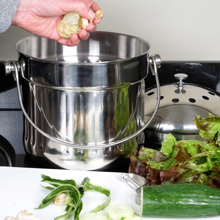 The RSVP Endurance Jumbo Compost Pail offers a durable, hygienic solution for collecting kitchen scraps. Crafted from 18/8 stainless steel with a polished body and brushed lid, it delivers long-term performance while maintaining a clean, modern look on the benchtop.