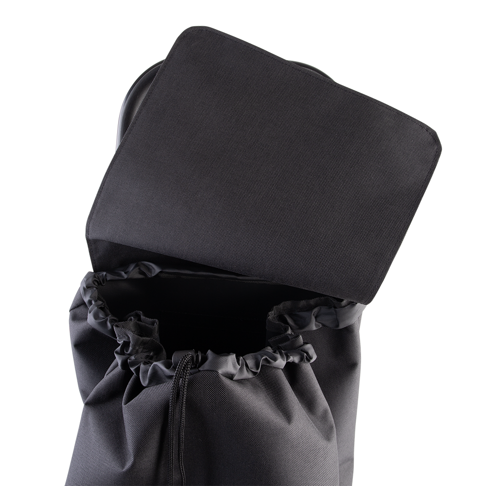 Multiple storage pockets keep smaller items secure and accessible, while the pull string closure helps keep contents contained during transport. Smooth rolling click on and off wheels and an ergonomic handle provide comfortable manoeuvrability. When not in use, the foldable base allows for compact storage.