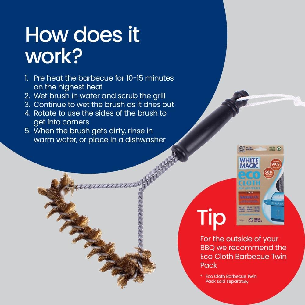 Before you start, preheat the barbecue on its highest heat setting for 10-15 minutes. Wet the brush in water and begin scrubbing the grill grates, adding water to the brush as needed to keep it damp. Rotate the brush to use its sides for reaching into corners and tight spots. Once the brush becomes dirty, rinse it under warm water or place it in the dishwasher for a thorough clean. For best results, oil your food rather than the grill to reduce food debris buildup.