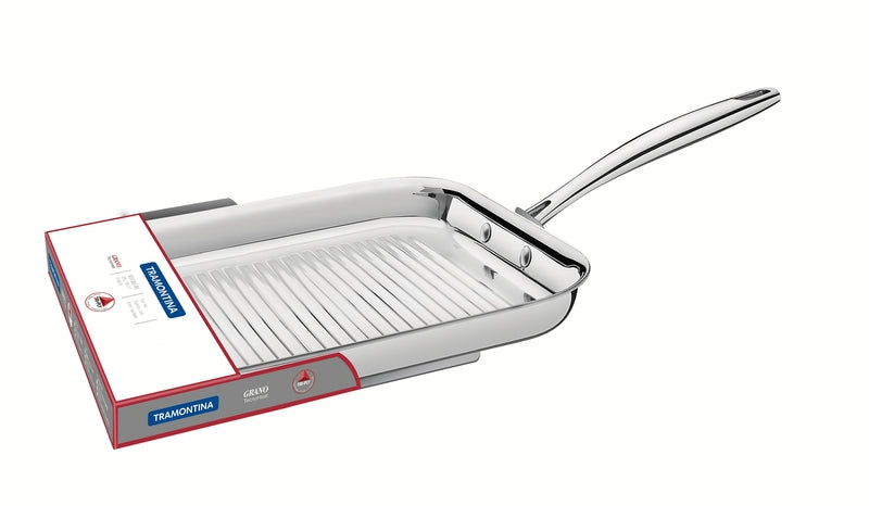 With Tramontina's Grano stainless steel skillet grill, preparing that grilled fish or steak is much easier. Ideal for daily use, this skillet guarantees resistance and durability with its stainless steel body, a non-toxic material that keeps your food healthy. It has a tri-ply body, a feature that provides fast, uniform cooking. It can be used on gas, electric, glass ceramic and induction cooktops, and can also go in the oven for browning or finishing dishes at a maximum temperature of 260°C/500°F. In addition to all these features, it's also very easy to clean and dishwasher safe. This skillet has a distinctive, contemporary design with a mirror finish that adds beauty and style to your kitchen!