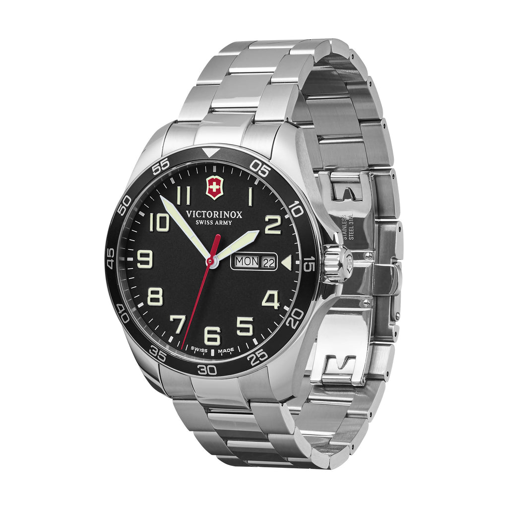 At the forefront of its field, the indispensable Fieldforce boasts striking red second hands with a Swiss Army Knife-shaped counterweight, and a red cross and shield on the dial. It offers unsurpassed day and night visibility thanks to the distinct Super-LumiNova®-enhanced display, and pays tribute to our roots with its new take on rugged, dynamic design. Know where you are, and get where you want to be, with a Fieldforce timepiece at your side.