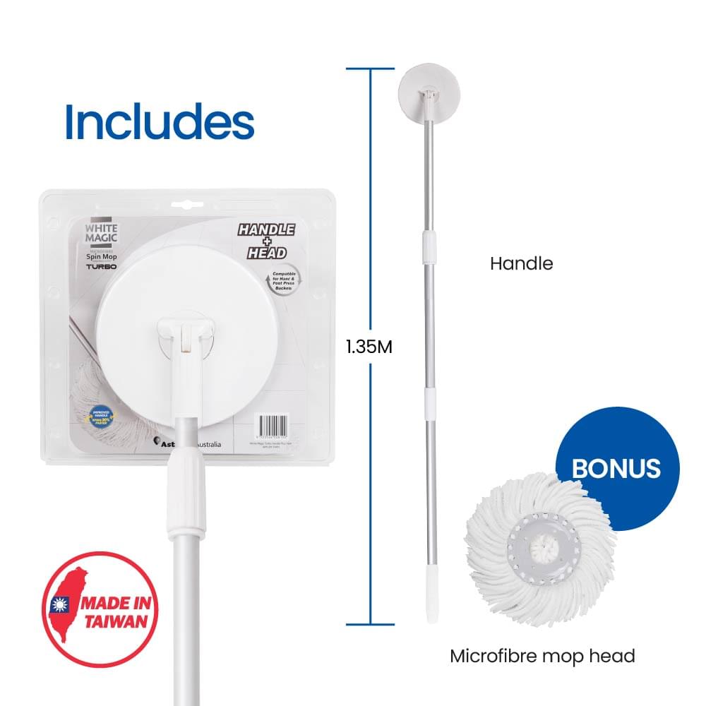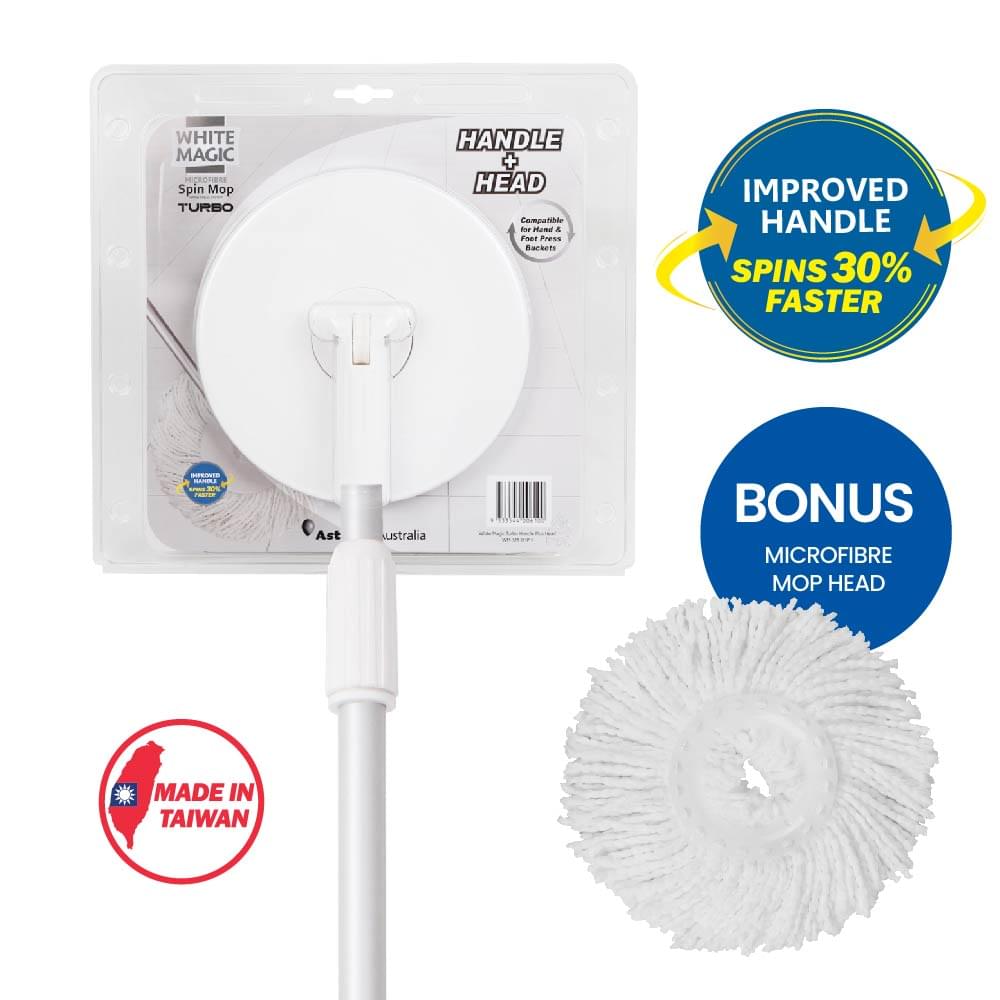 The White Magic Turbo Spin Mop Hand Press Handle Plus Head is a versatile cleaning tool designed to enhance your floor cleaning experience. This set includes a durable handle and an extra microfibre mop head, ensuring you have the essentials for effective cleaning.